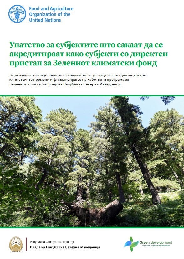 Овој документ е подготвен од Организацијата за храна и земјоделство при ООН (ФАО) и Кабинетот на заменикот на претседателот на Владата на Република Северна Македонија задолжен за економски прашања, координација со економските ресори и инвестиции, во рамки на вториот проект на Северна Македонија од програмата за Подготвеност и подготвителна поддршка на Зелениот климатски фонд ‘’Зајакнување на националните капацитети за ублажување и адаптација кон климатските промени и финализирање на Работната програма за Зелениот климатски фонд’’. Документот дава упатства кои треба да ги земат предвид субјектите пред да започнат со постапката за акредитација за Зелениот климатски фонд. Содржи краток опис на главните чекори од процесот за акредитација, информации за најважните политики, како и објаснувања за секој дел од образецот за аплицирање за субјект со директен пристап до Зелениот климатски фонд.
